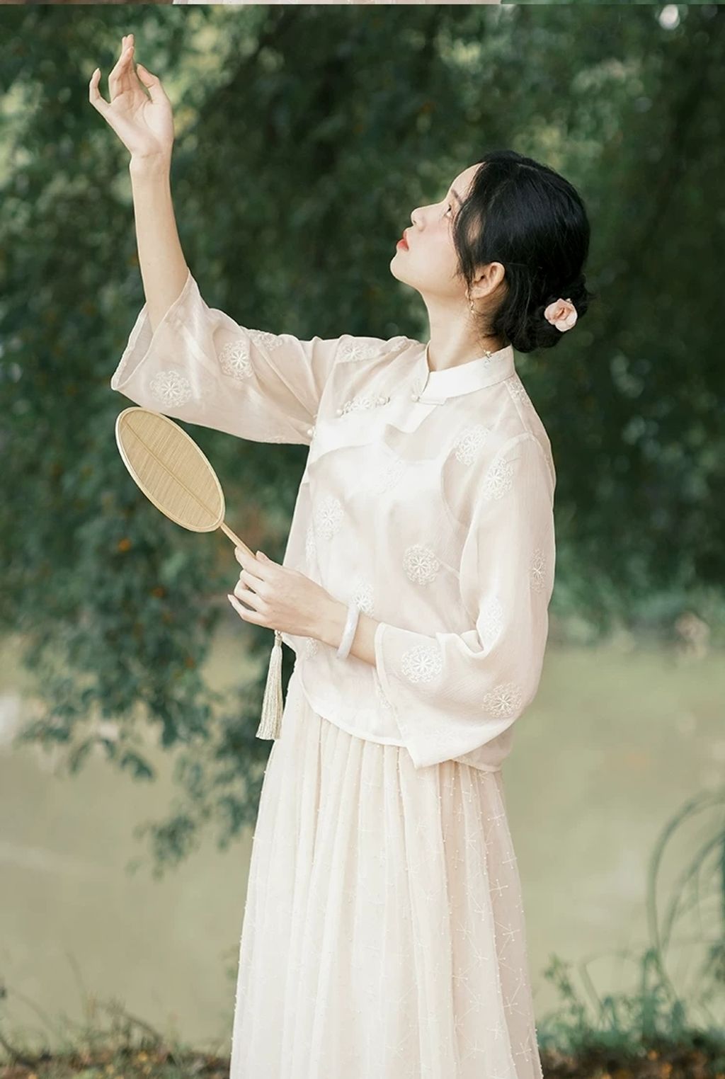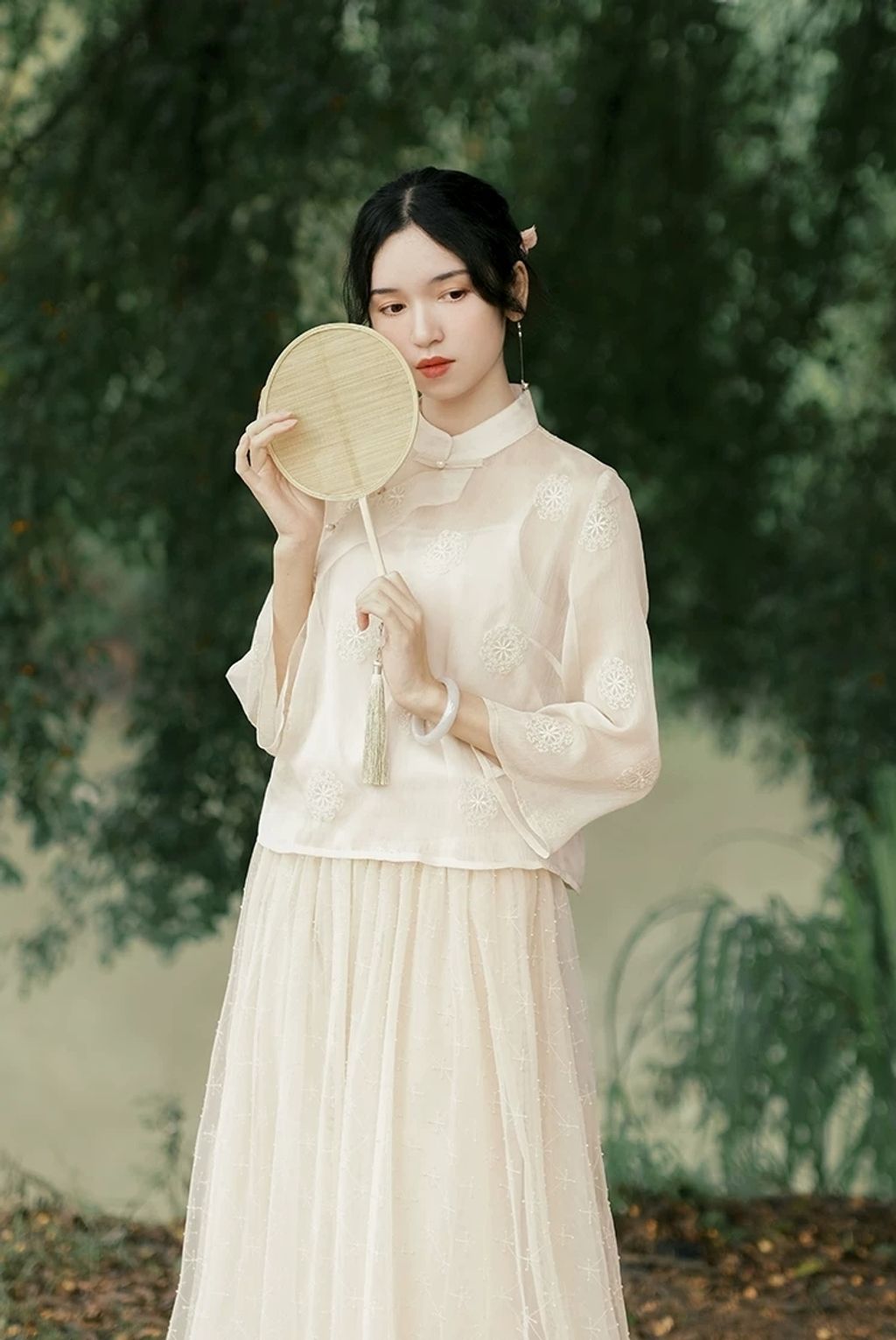 復古溫柔改良旗袍米色雪紡繡花上衣網紗珠珠半裙春