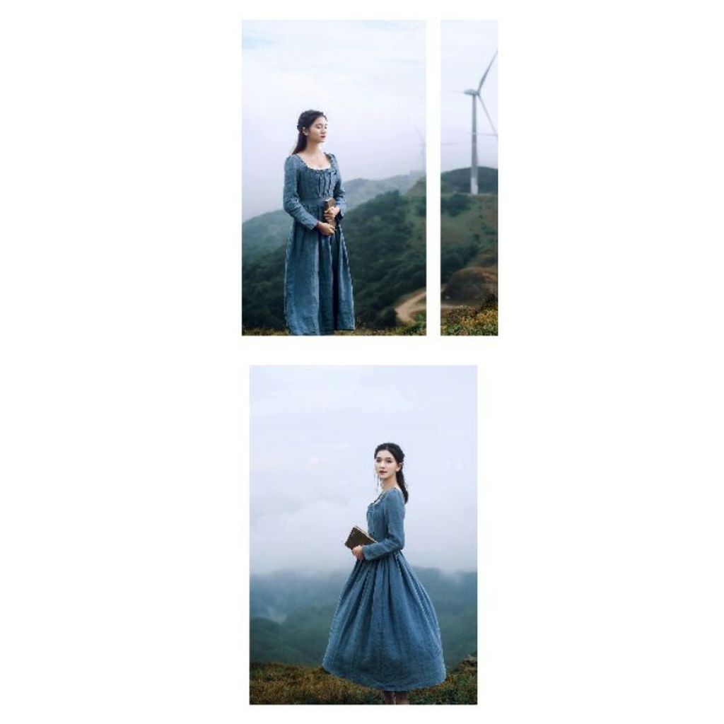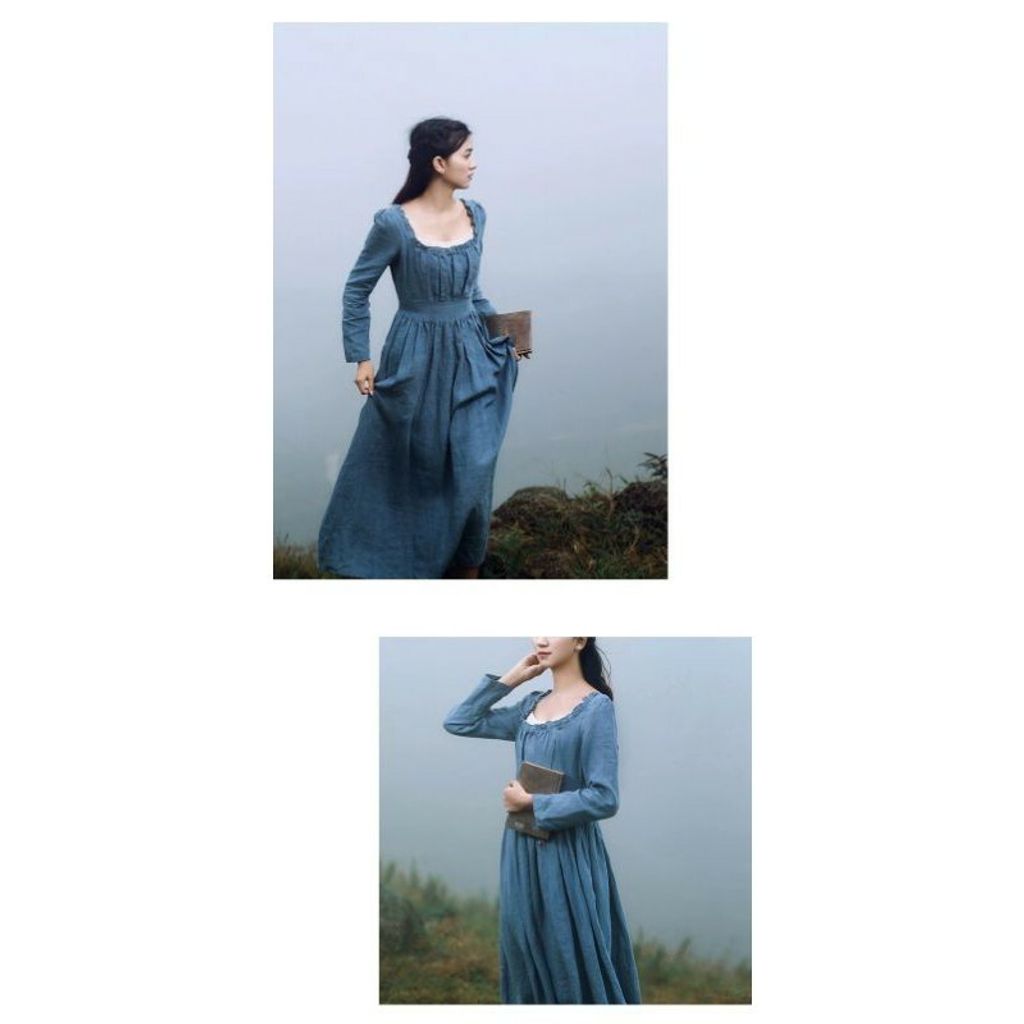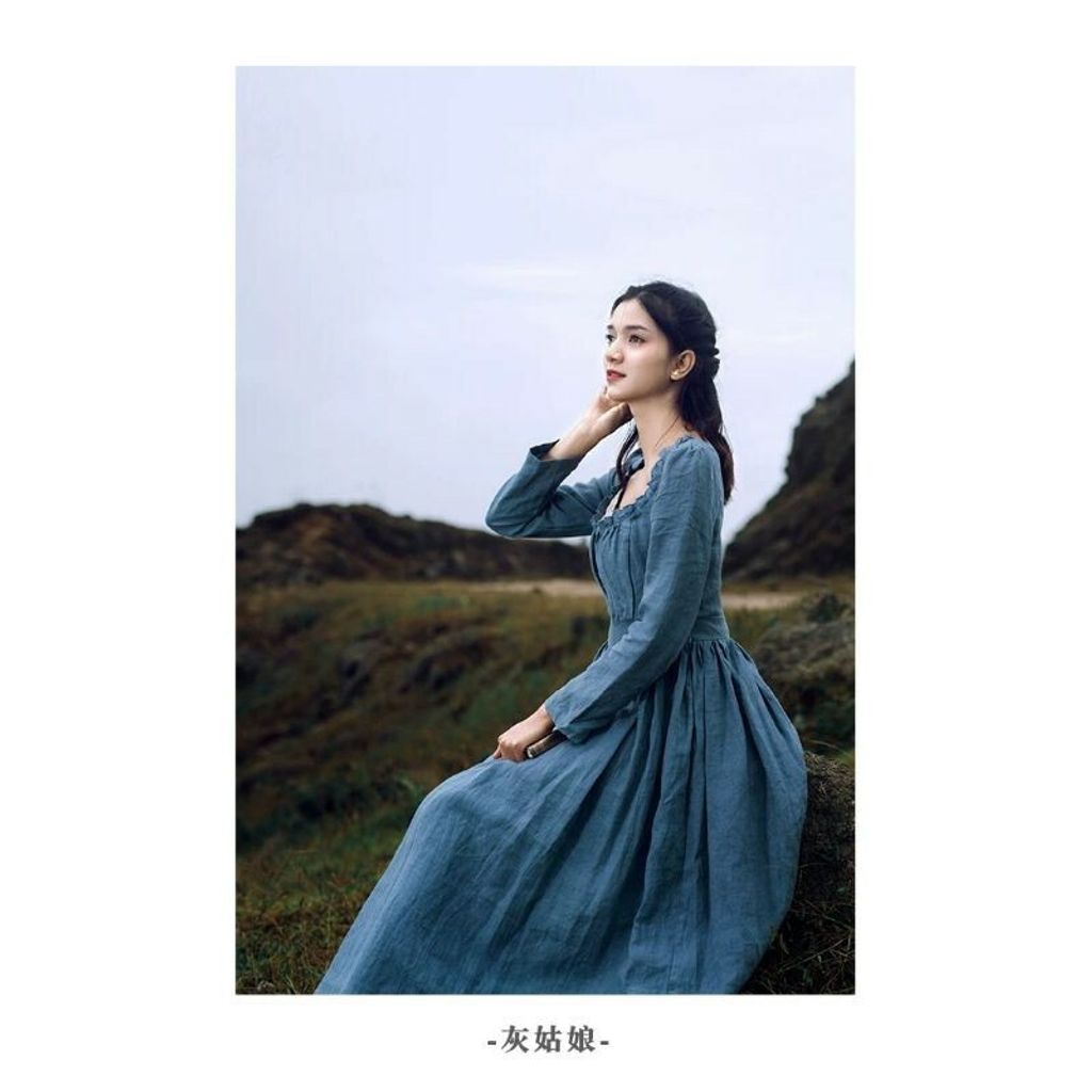 法式優雅復古宮廷長袖方領亞麻修身秋冬洋裝