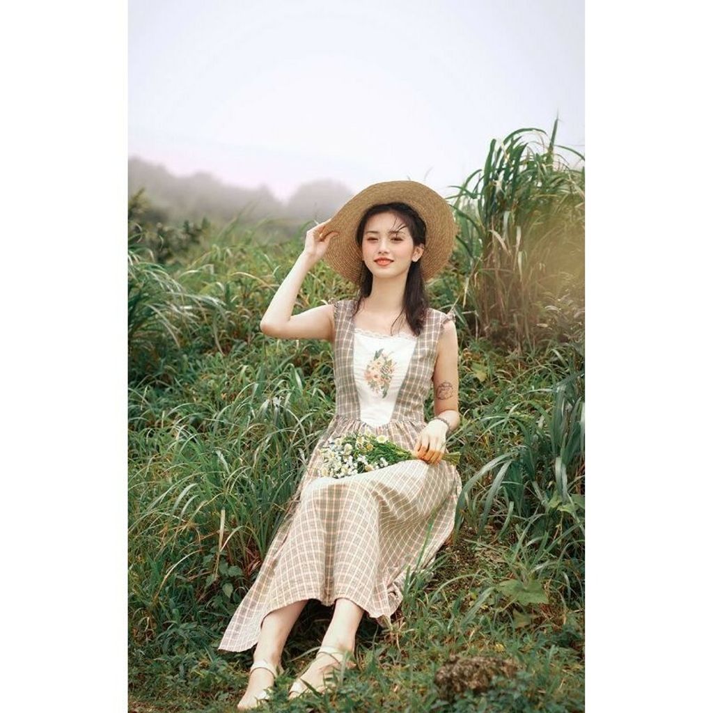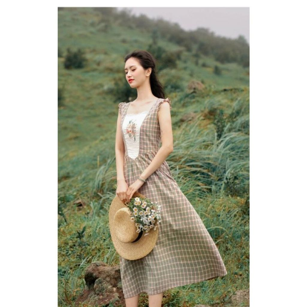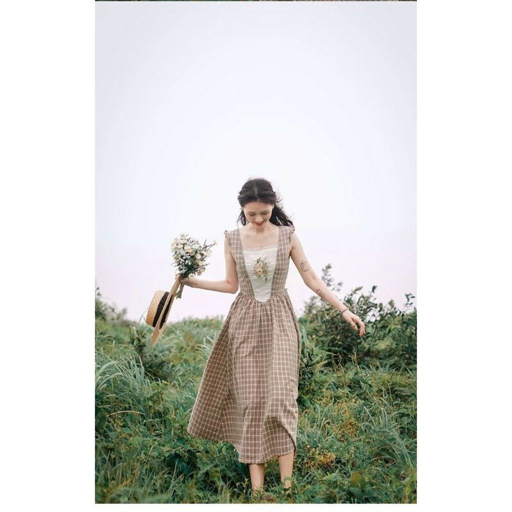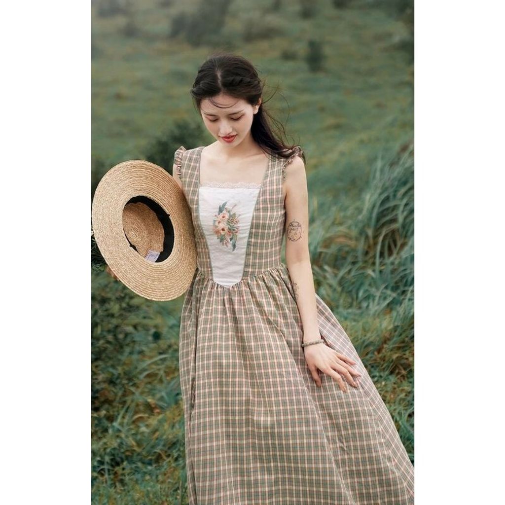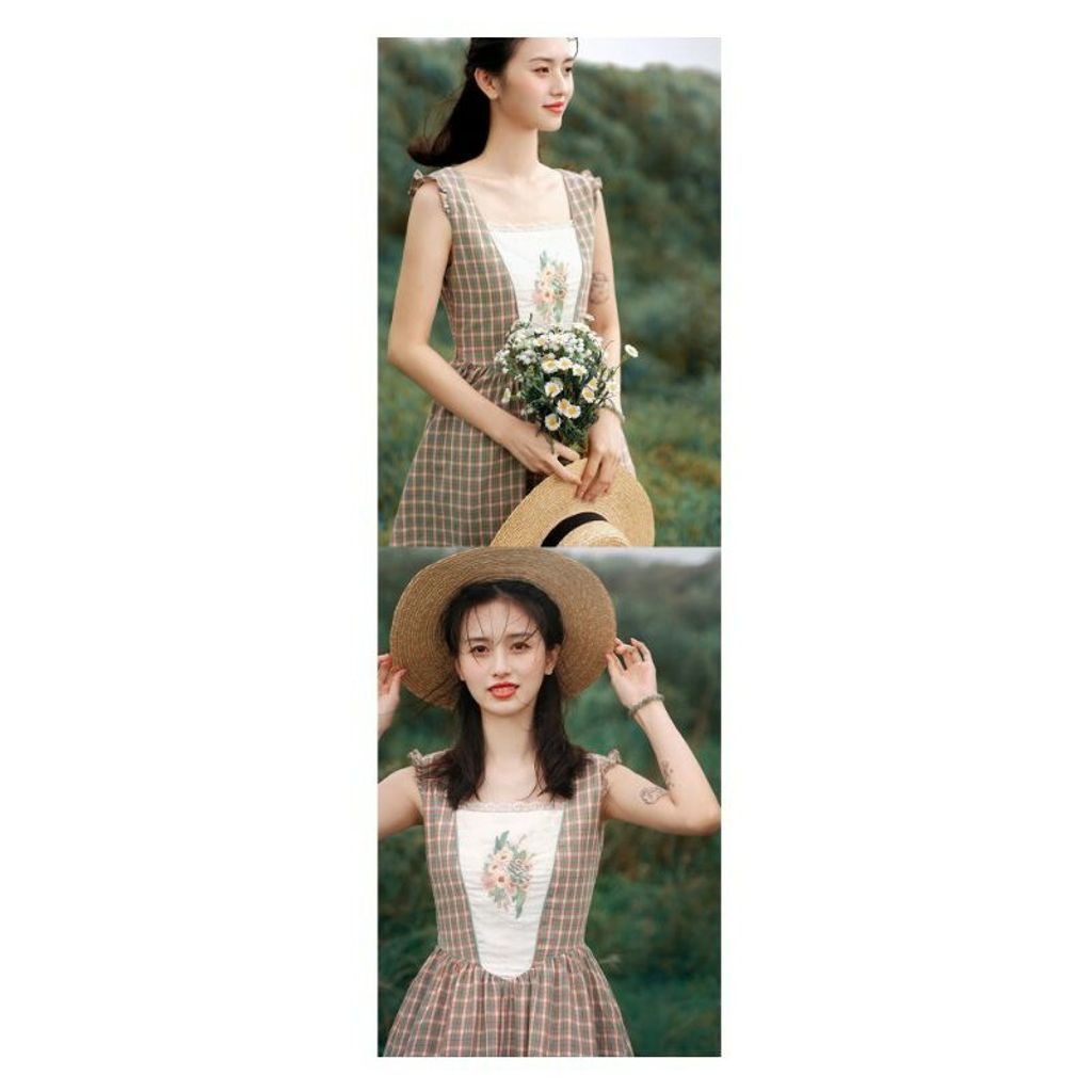法式田園復古刺繡格子蕾絲拼色宮廷連衣裙新品女裝