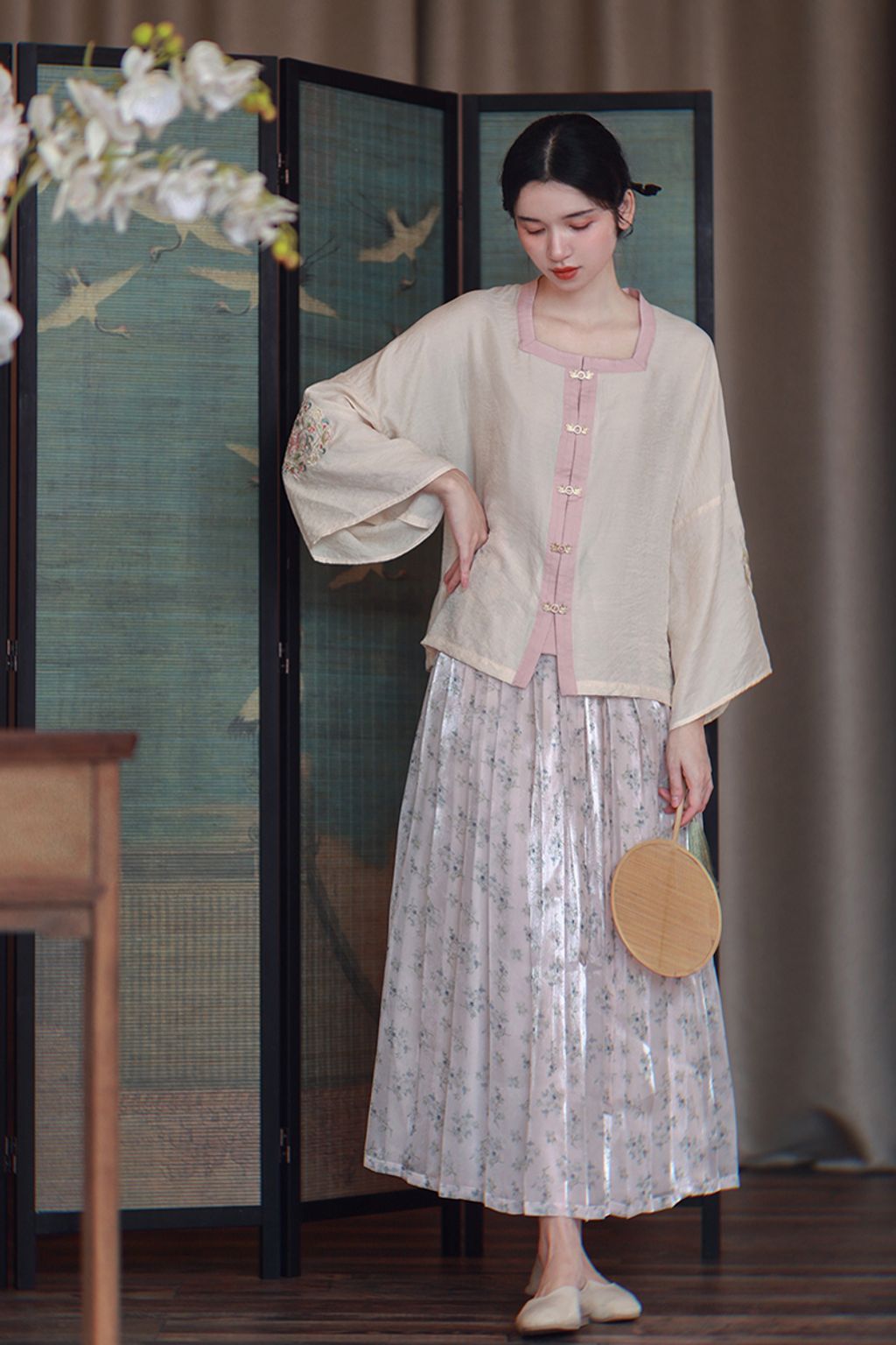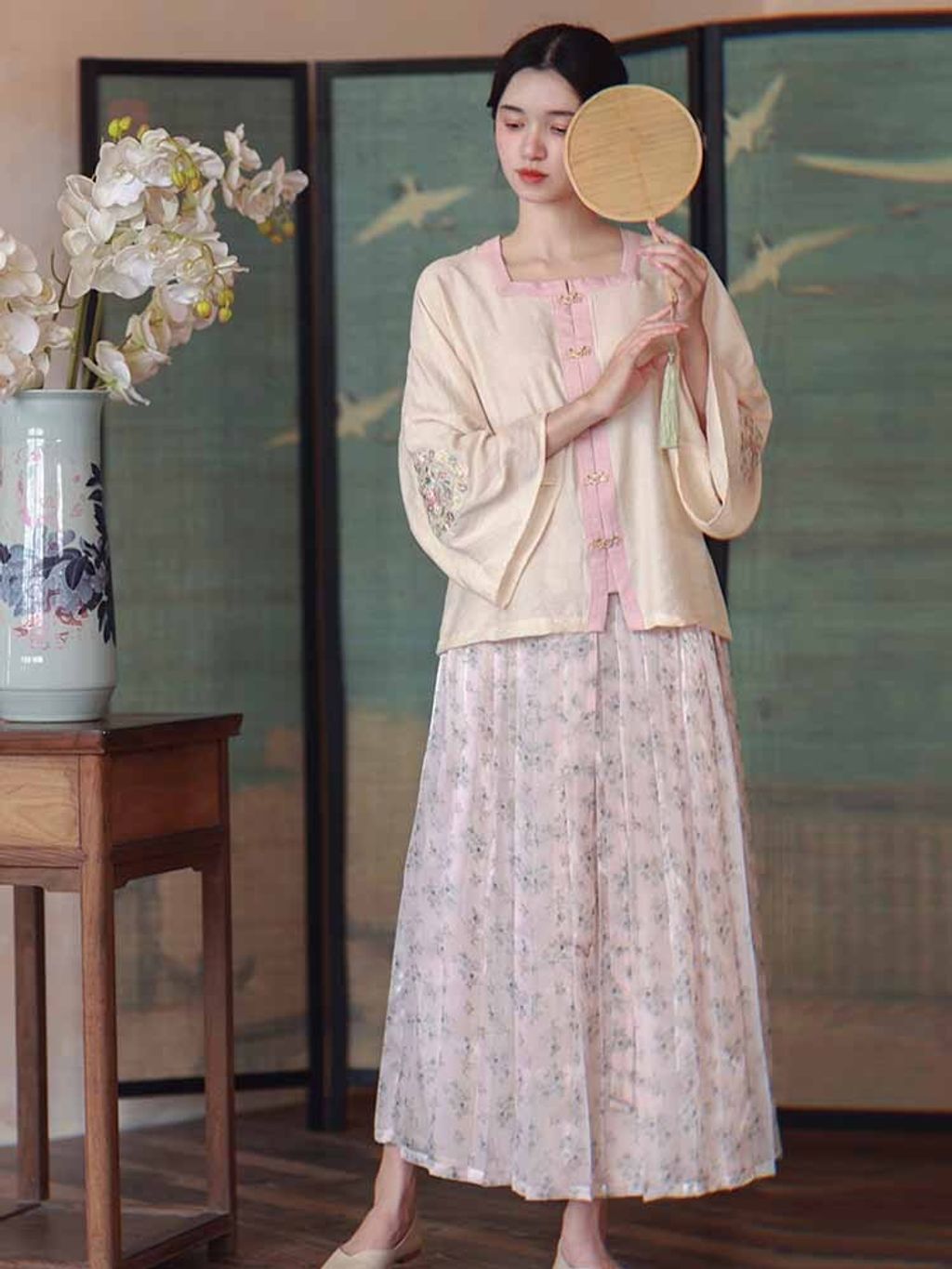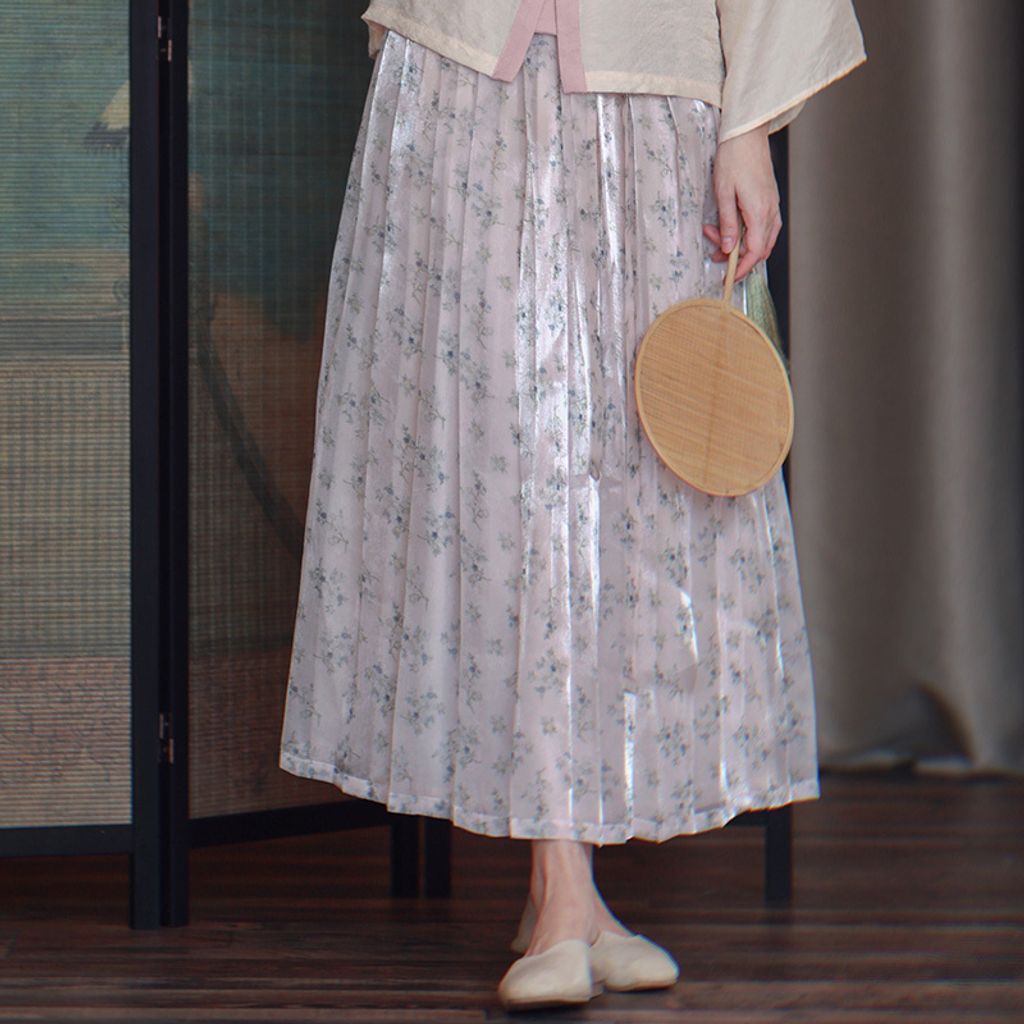 水凝 新中式国风复古欧根纱印花半身裙汉元素一片式褶裙