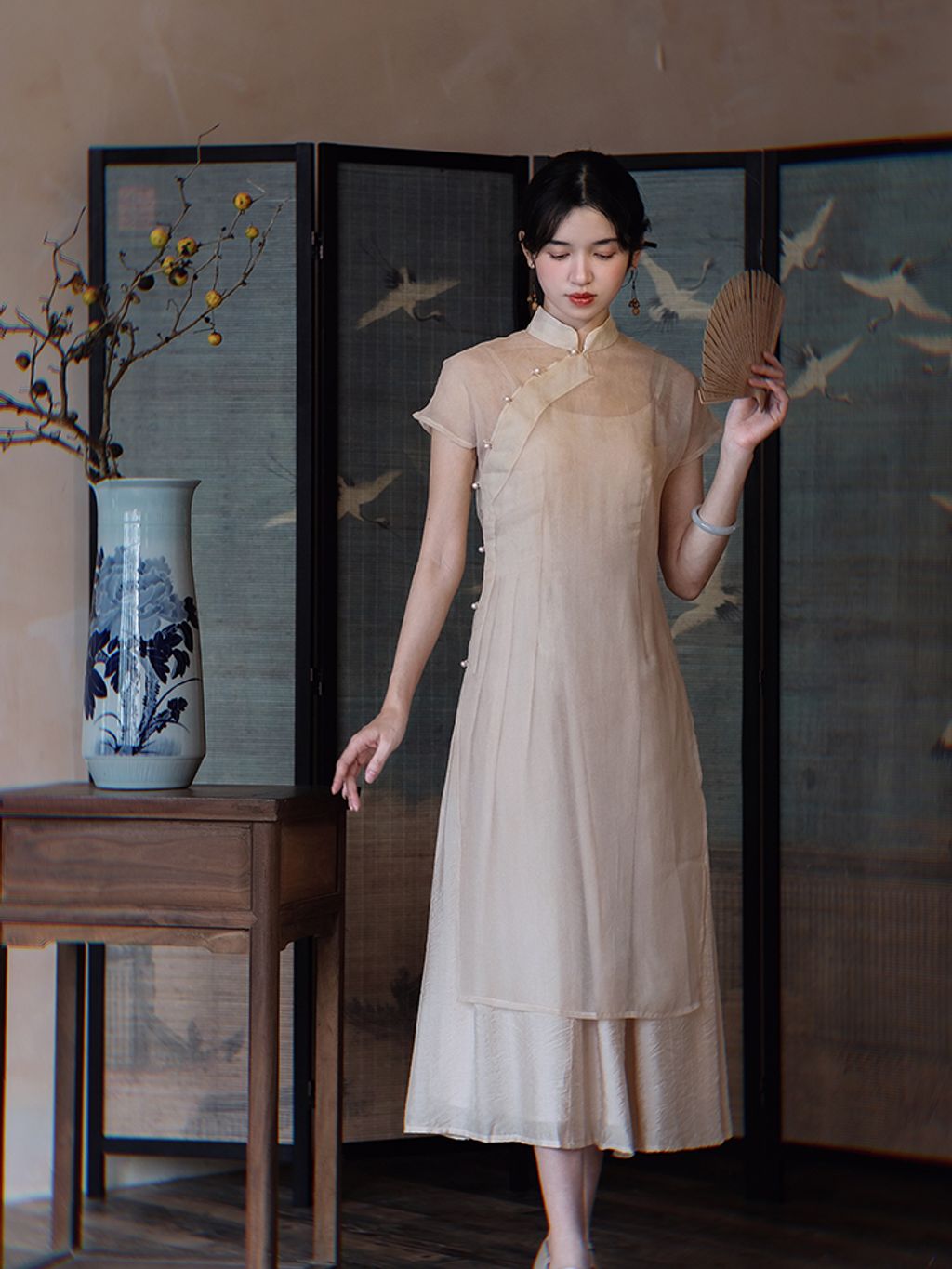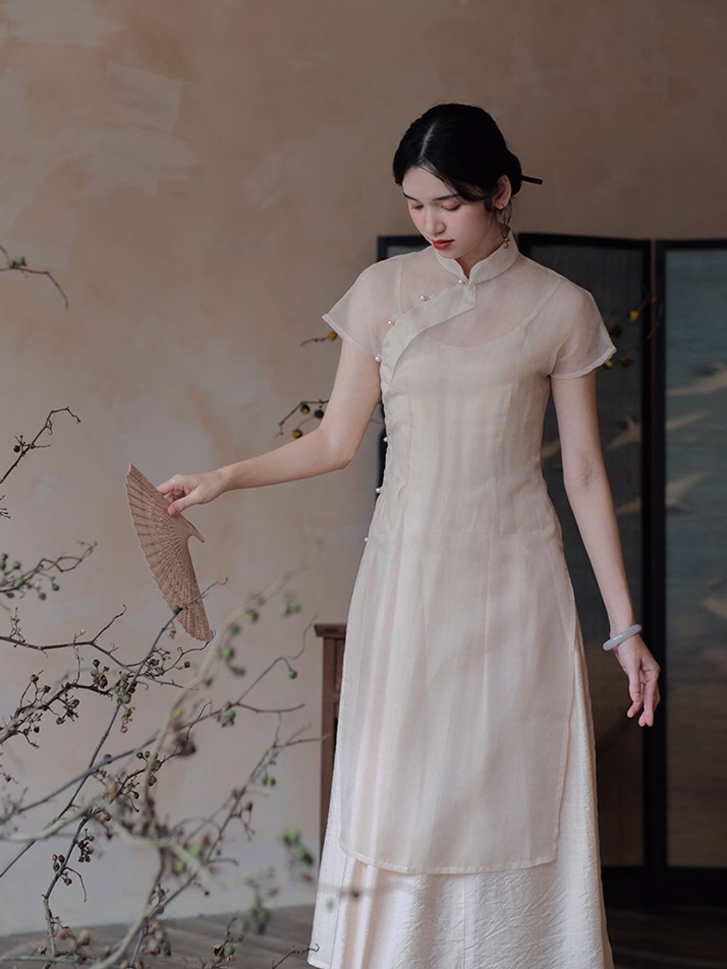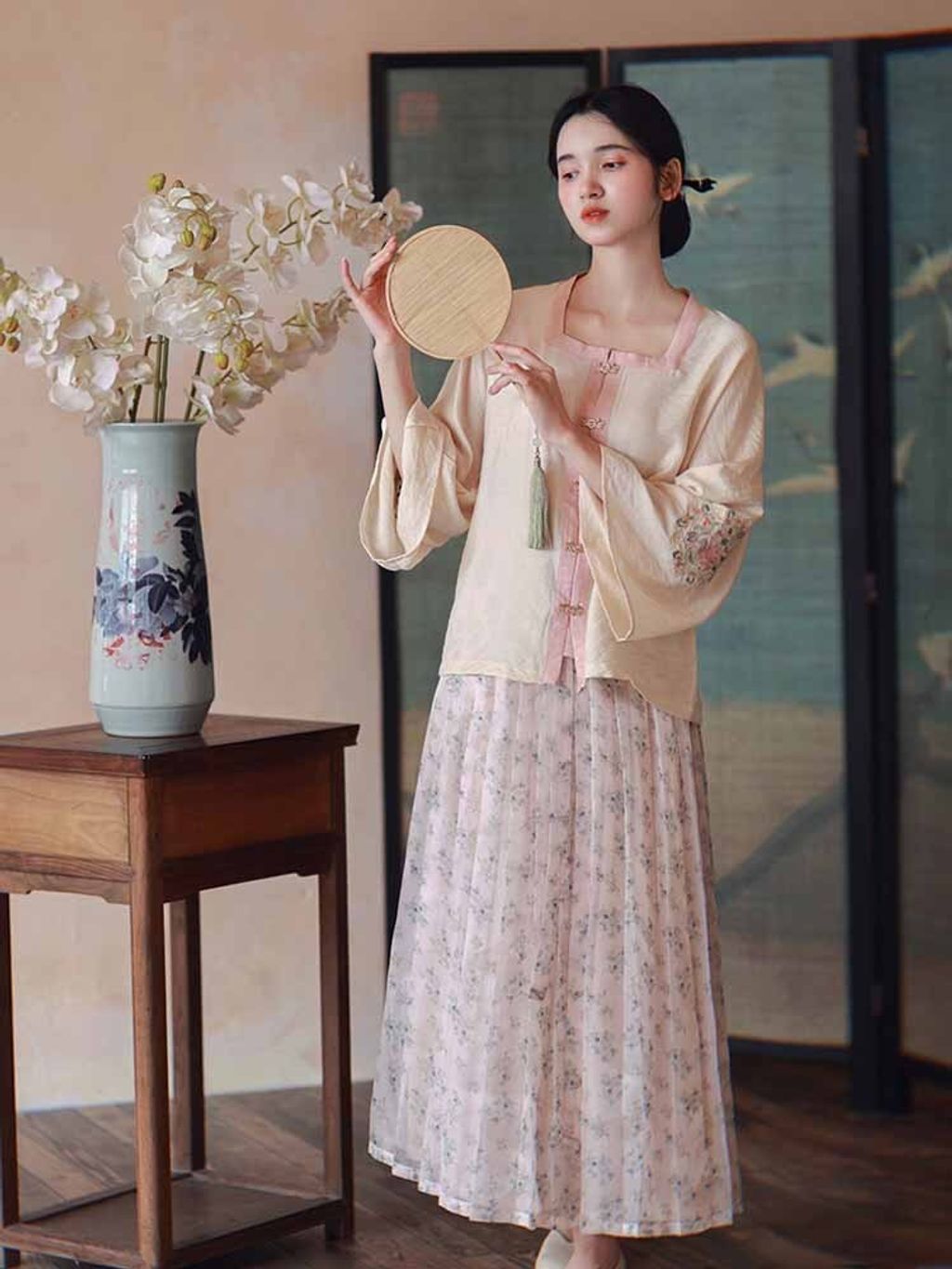 水凝 新中式国风复古欧根纱印花半身裙汉元素一片式褶裙